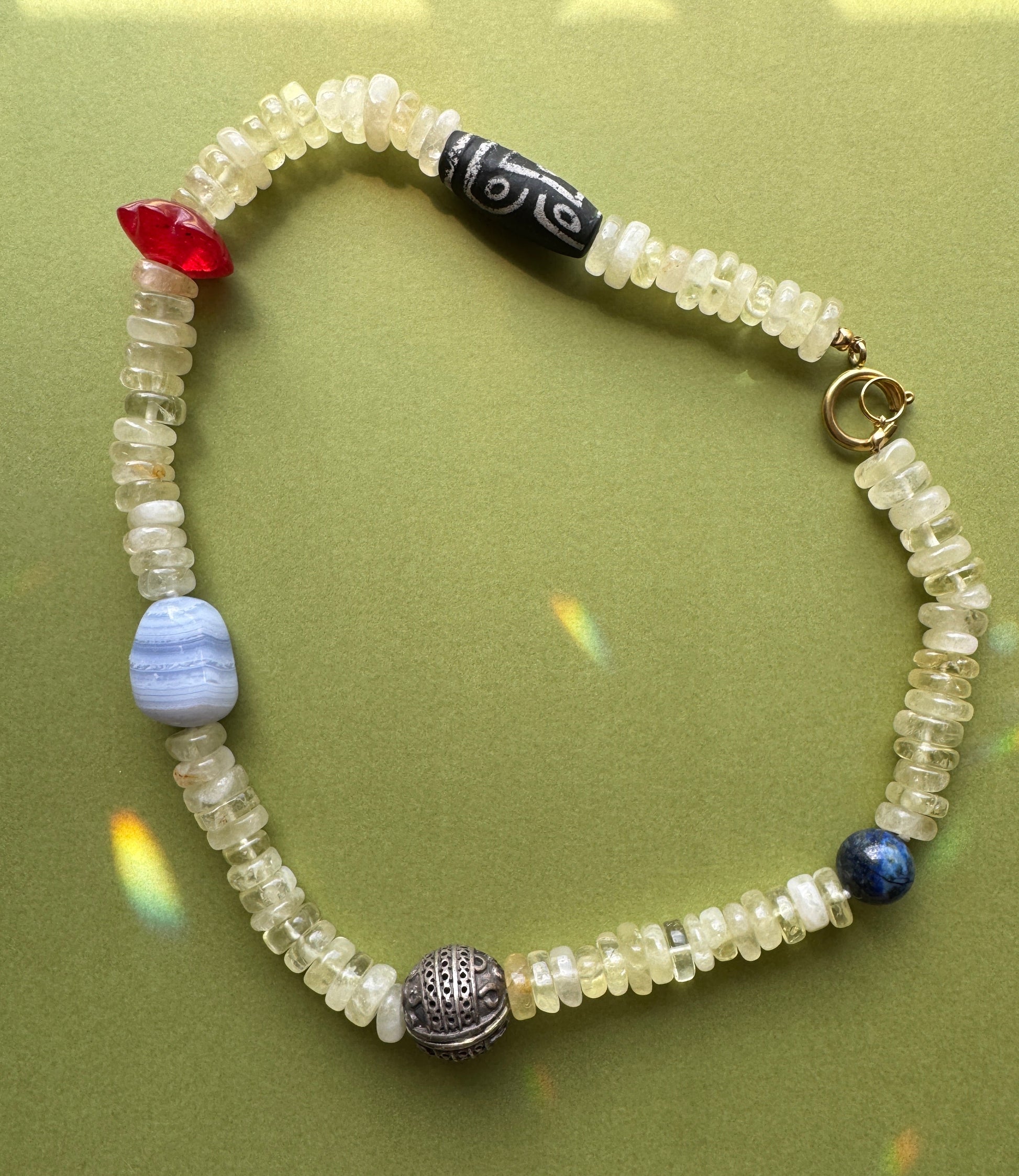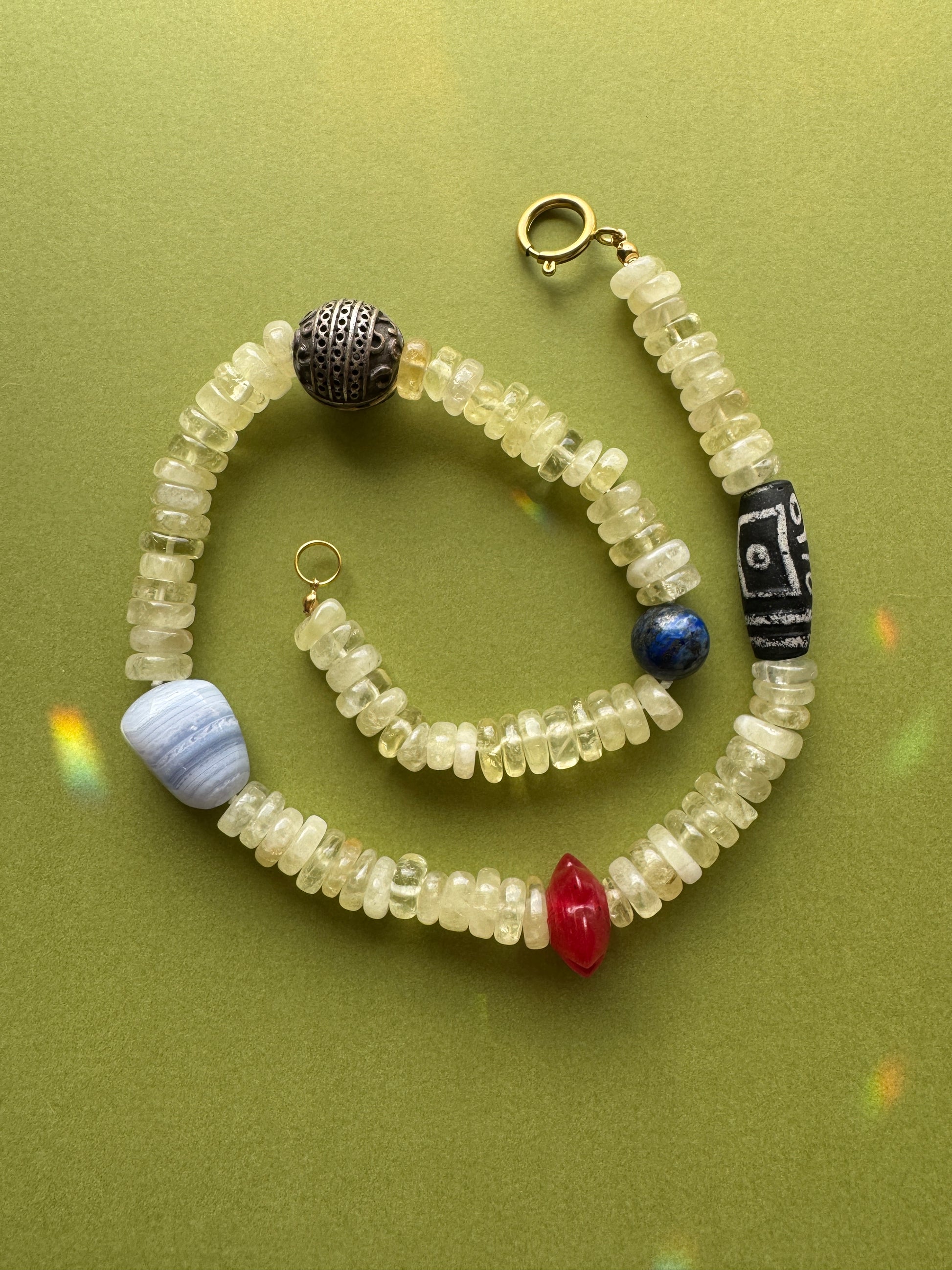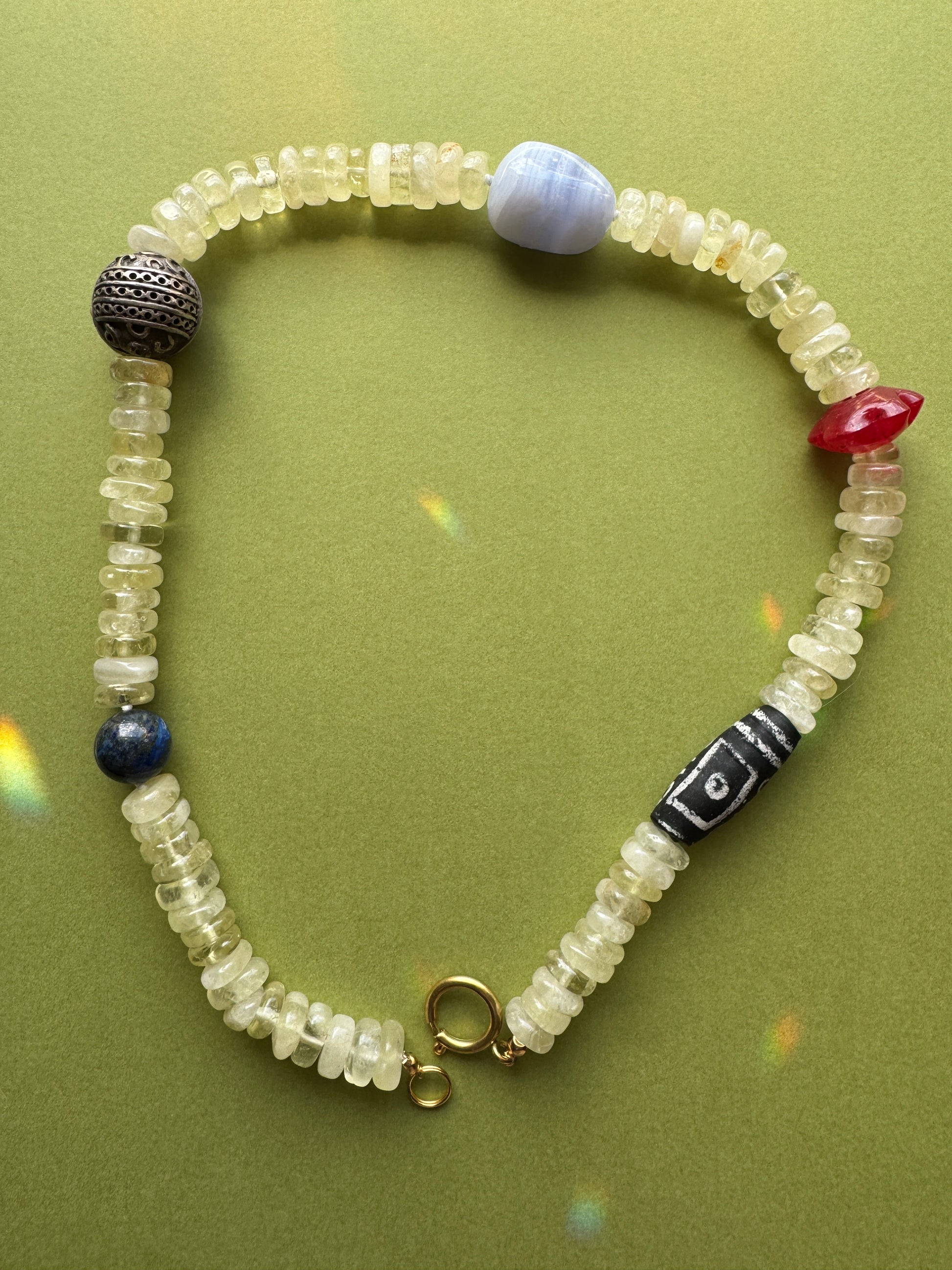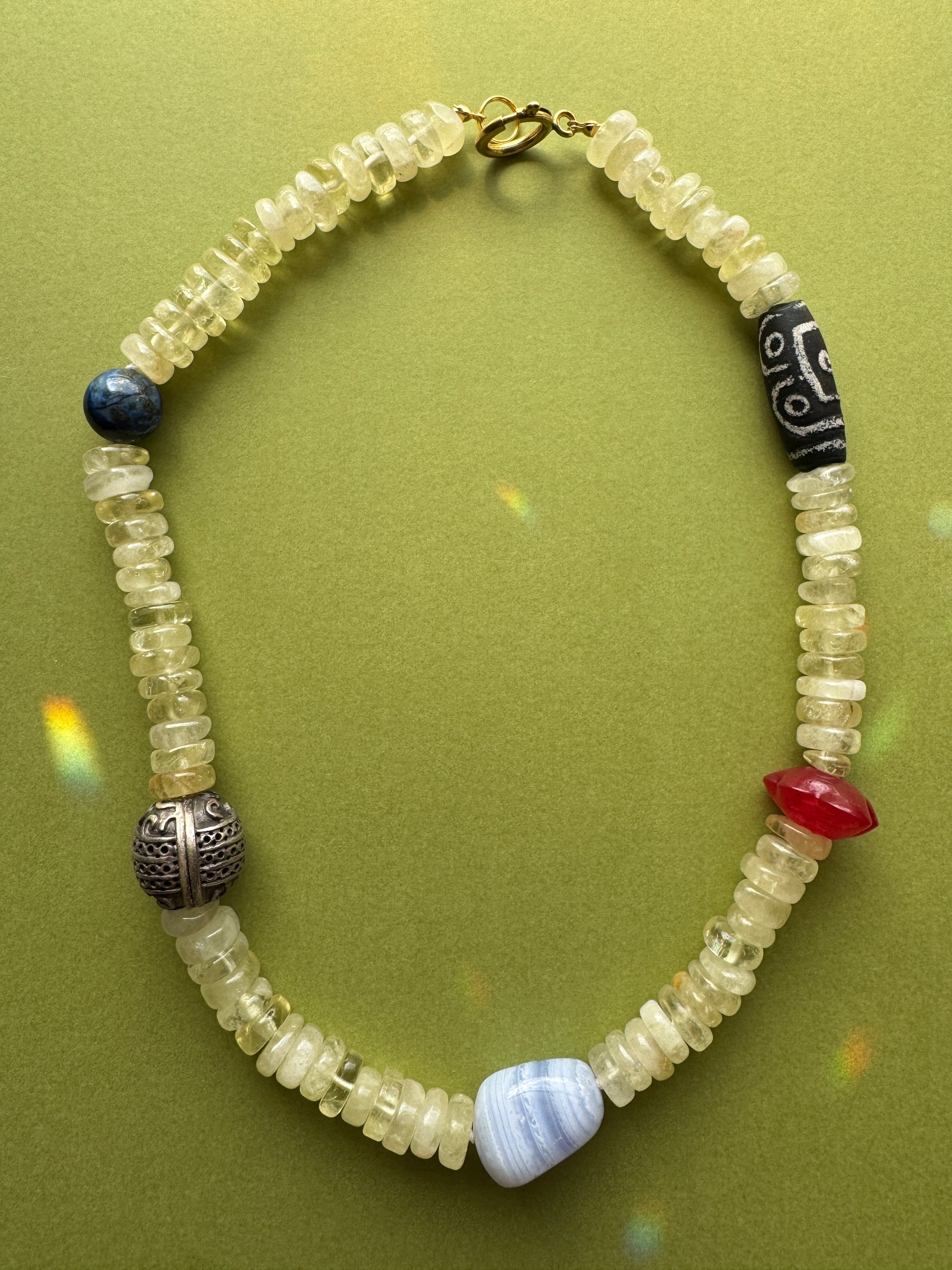 Variation I: 21 inches of Lemon Quartz stones hand knotted and interspersed with vintage glass and metal beads, blue lace agate, lapis lazuli, ending with brass clasp and jump ring.