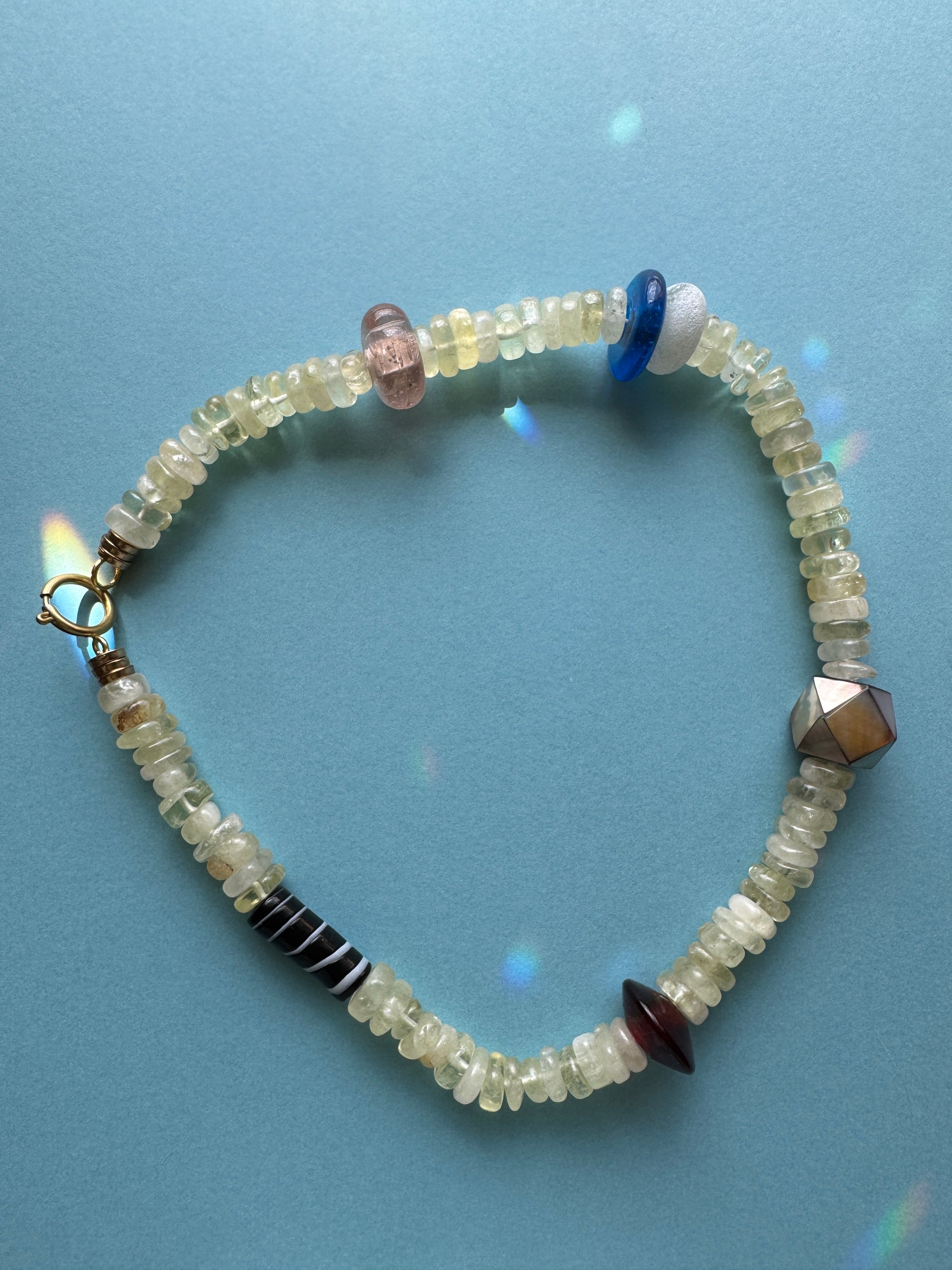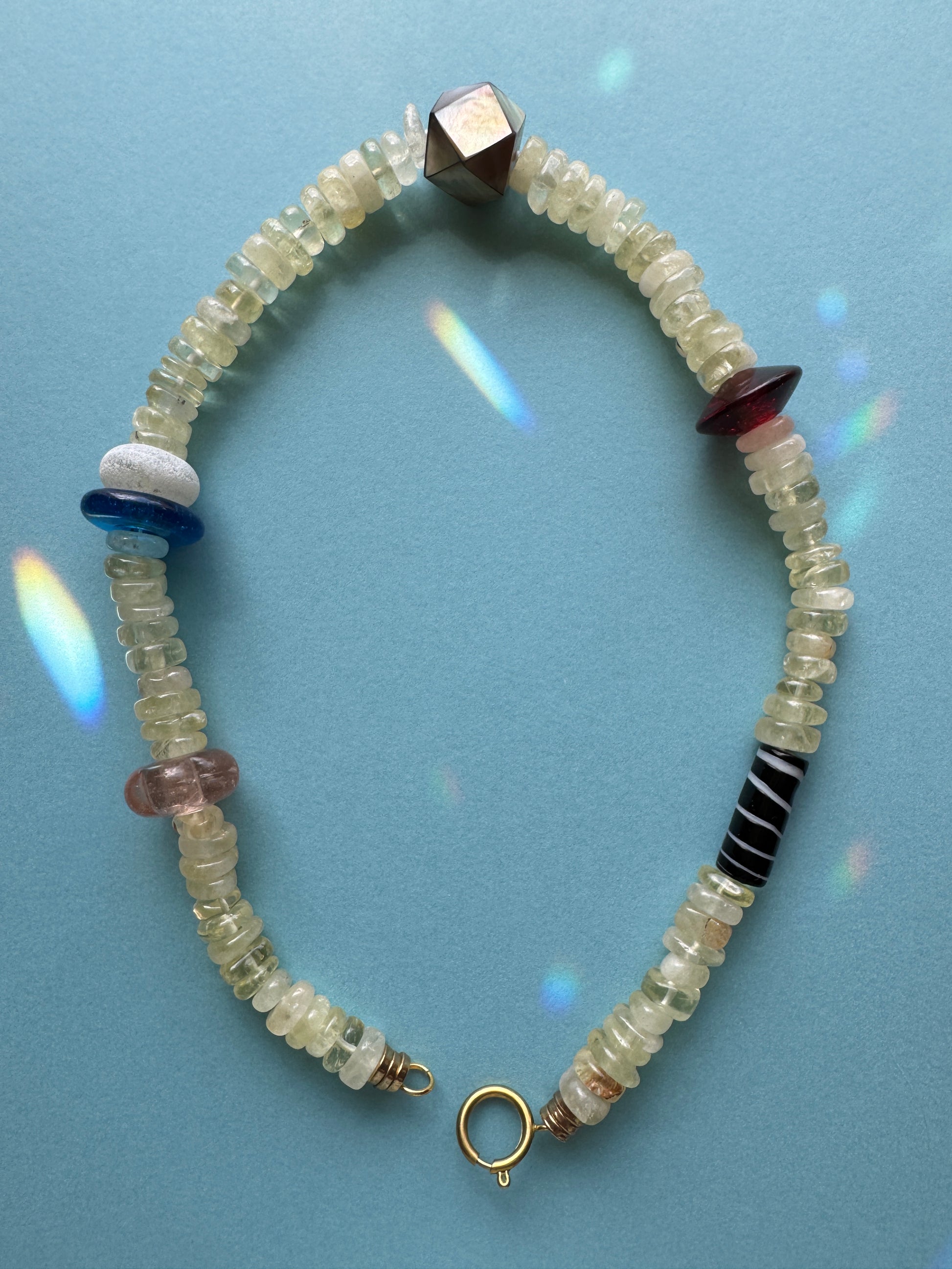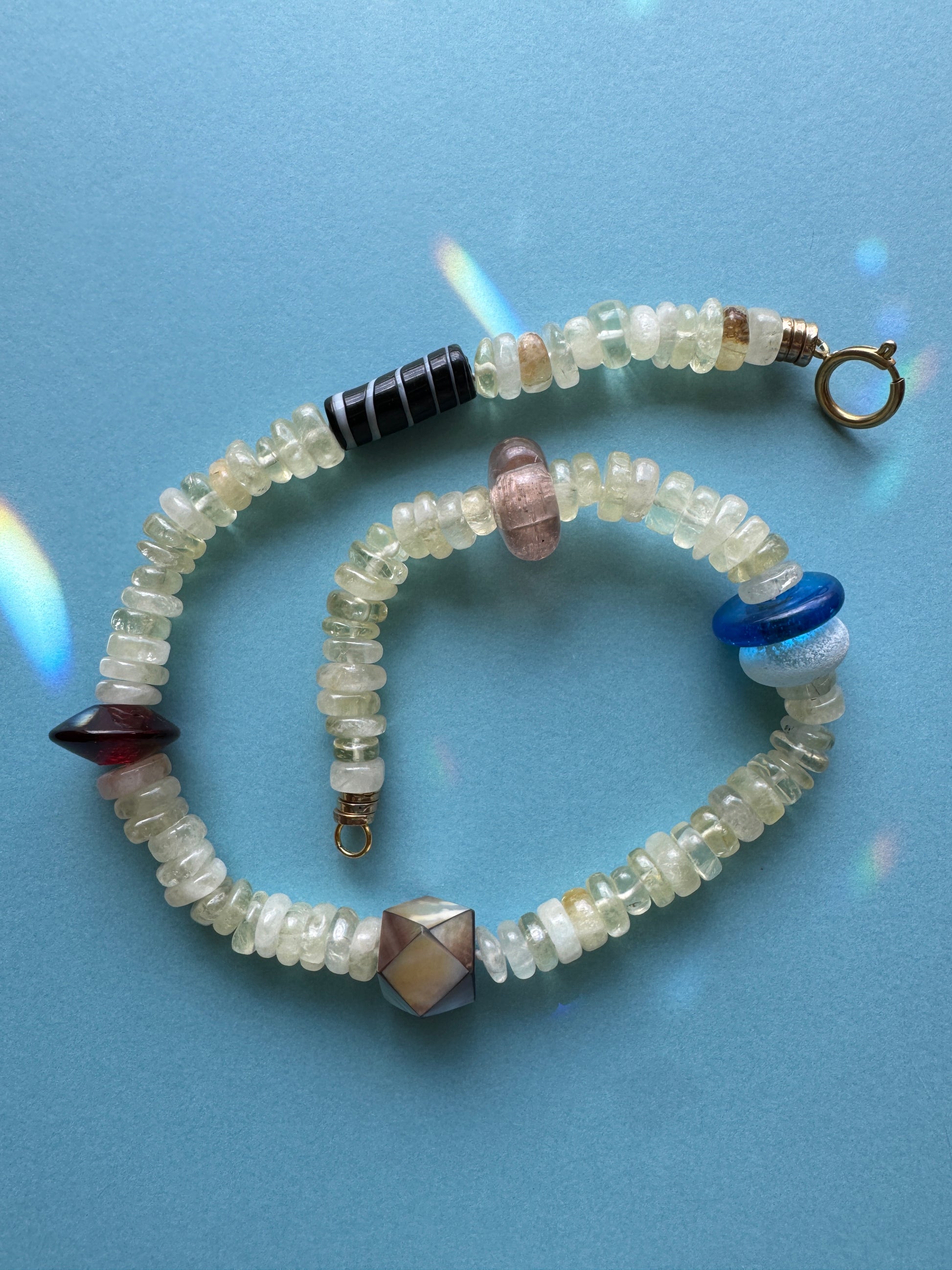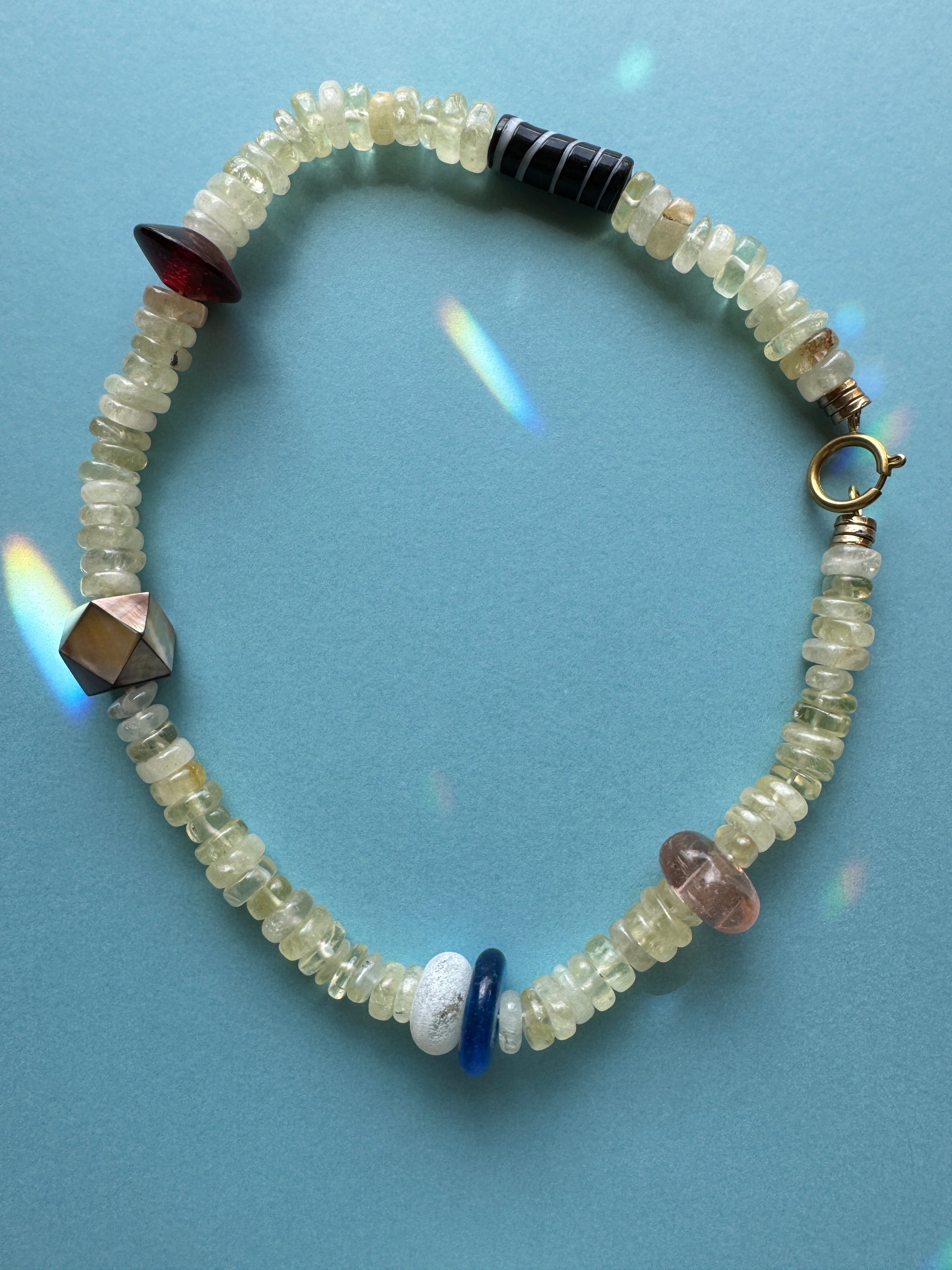 Variation I: 21 inches of Lemon Quartz stones hand knotted and interspersed with vintage glass and metal beads, blue lace agate, lapis lazuli, ending with brass clasp and jump ring.
