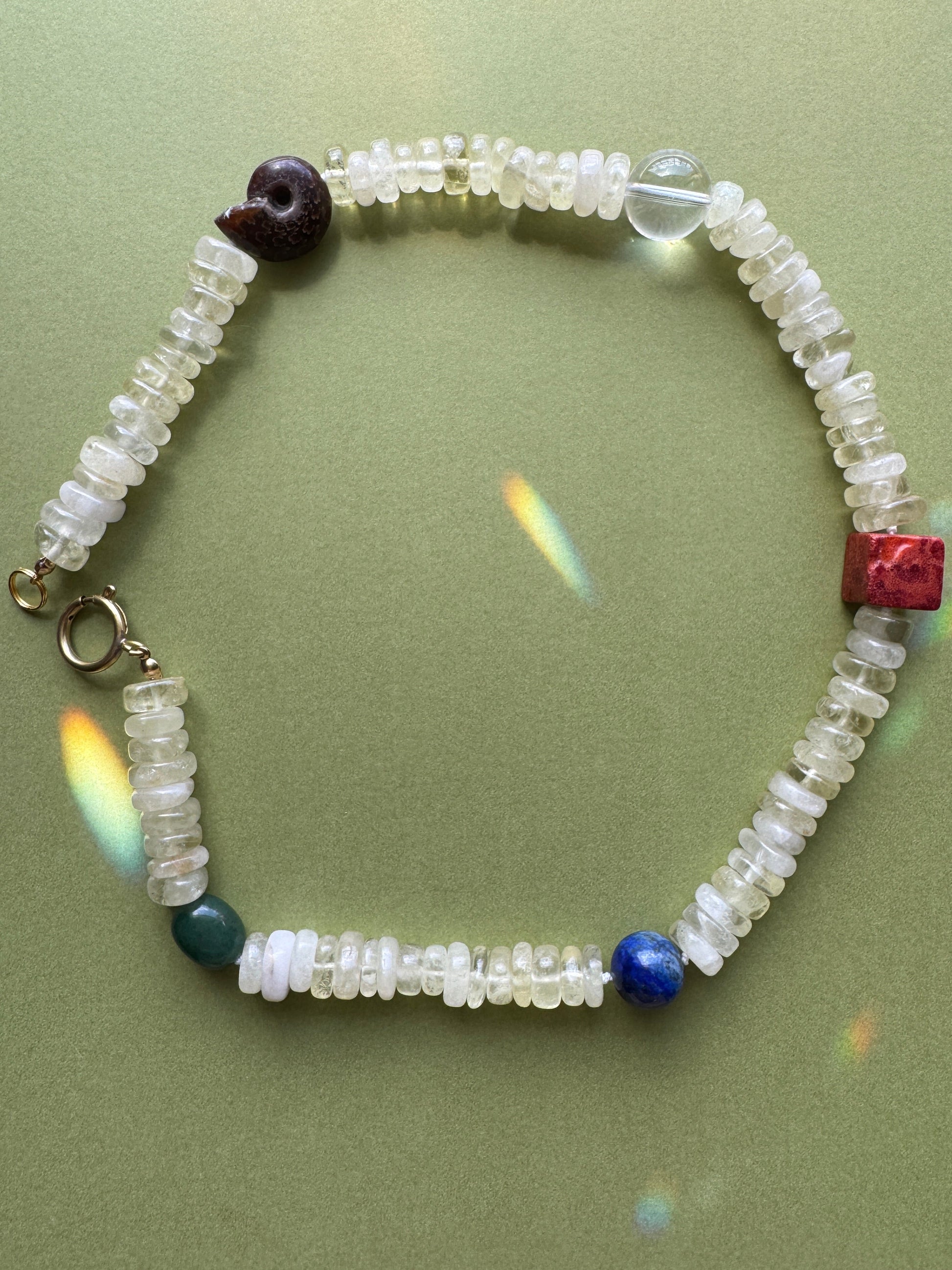 Variation II: 20 inches of Lemon Quartz stones hand knotted and interspersed with green adventurine, lapis lazuli, red jasper, clear quartz, and ammonite, ending with brass clasp and jump ring.