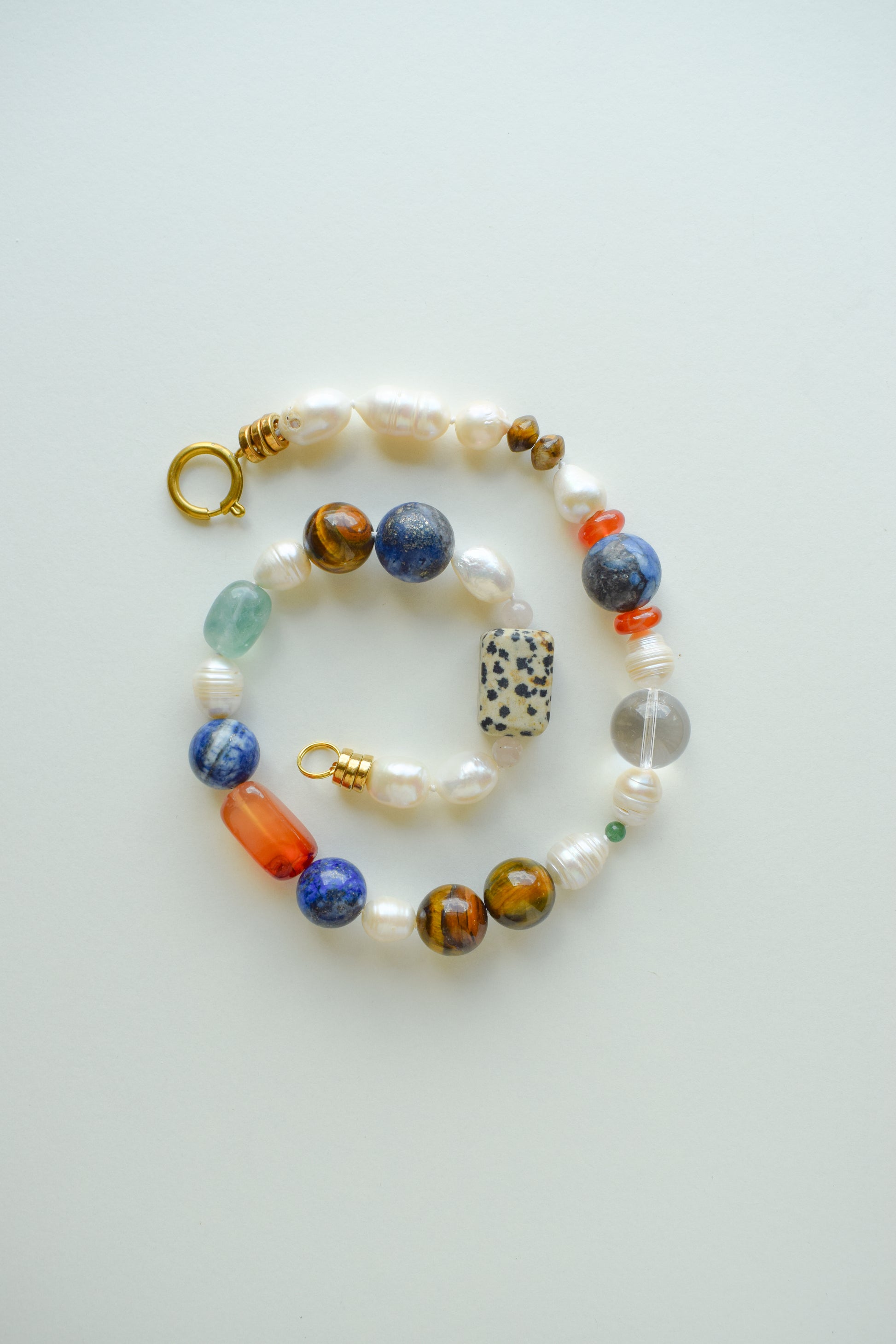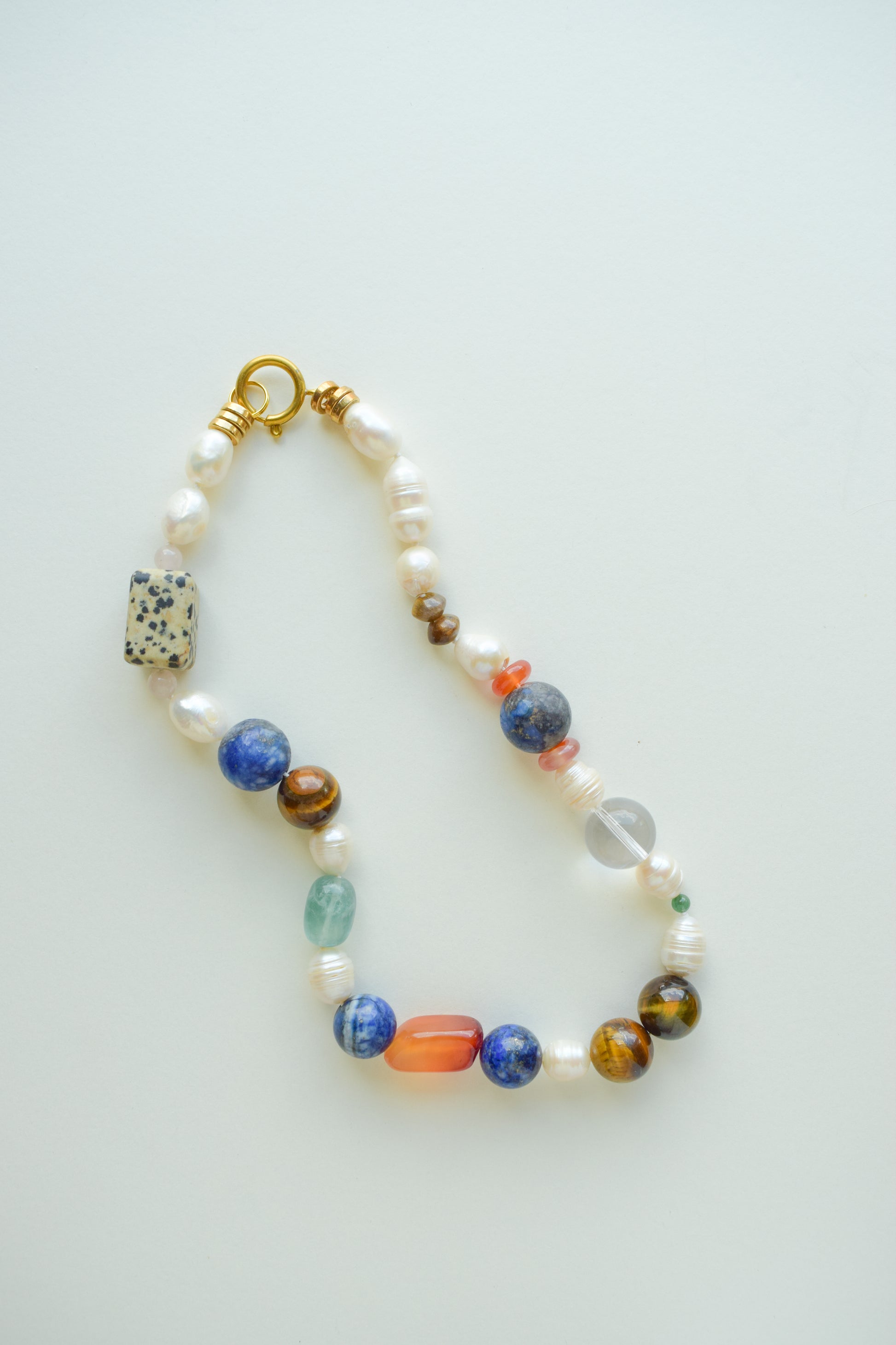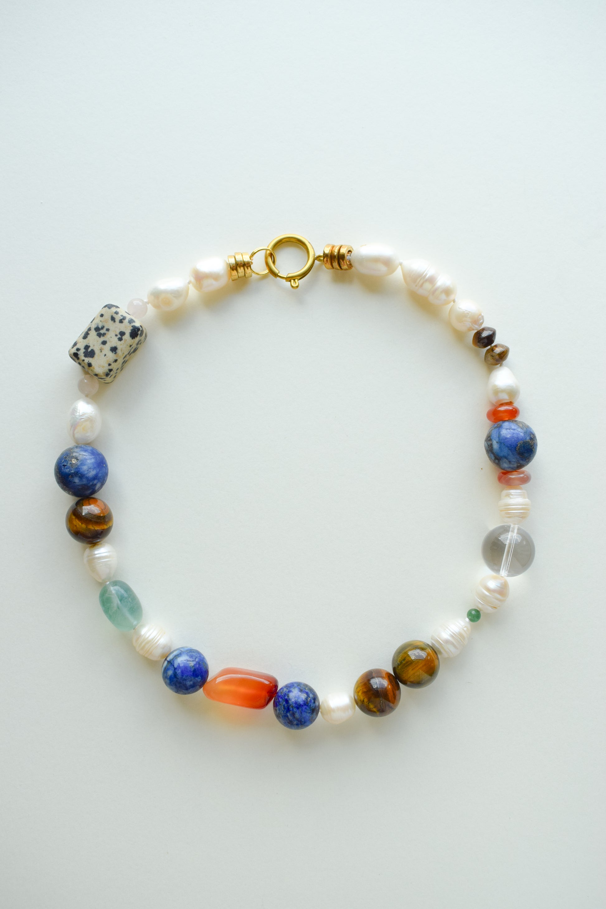 Discover the essence of individuality with the Ipseity Necklace, inspired by the profound concept of being truly oneself—your unique identity and unwavering sense of self. This elegant piece combines the calming luster of Pearl with the grounding strength of Tiger’s Eye, the spiritual depth of Lapis Lazuli, the invigorating warmth of Carnelian, the serene energy of Jade, and the playful earthiness of Dalmatian Jasper. Each carefully selected stone works in harmony to encourage inner solitude, clarity, and self-awareness. Wear the Ipseity Necklace as a sophisticated symbol of your journey toward authenticity, free from the constraints of external expectations.