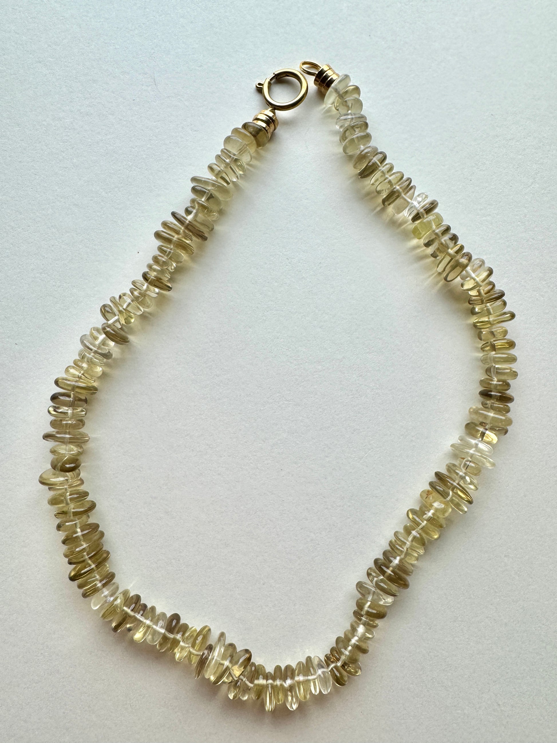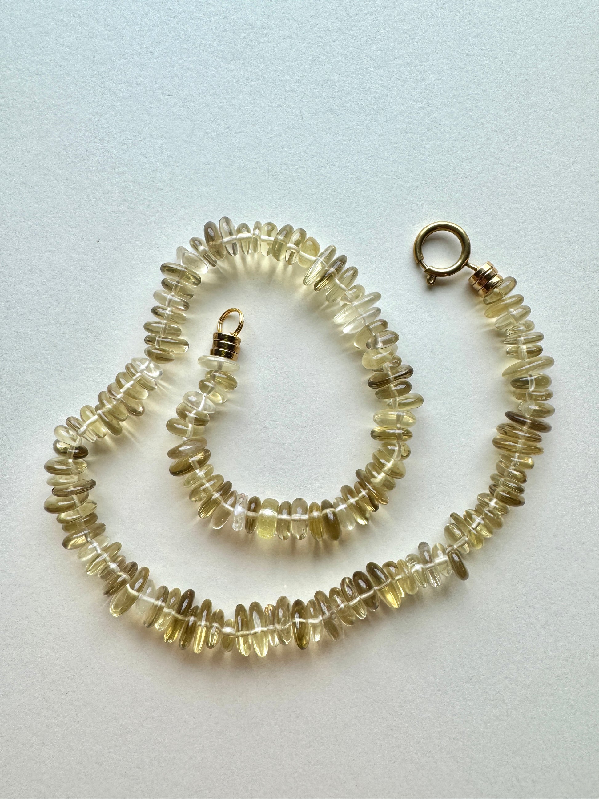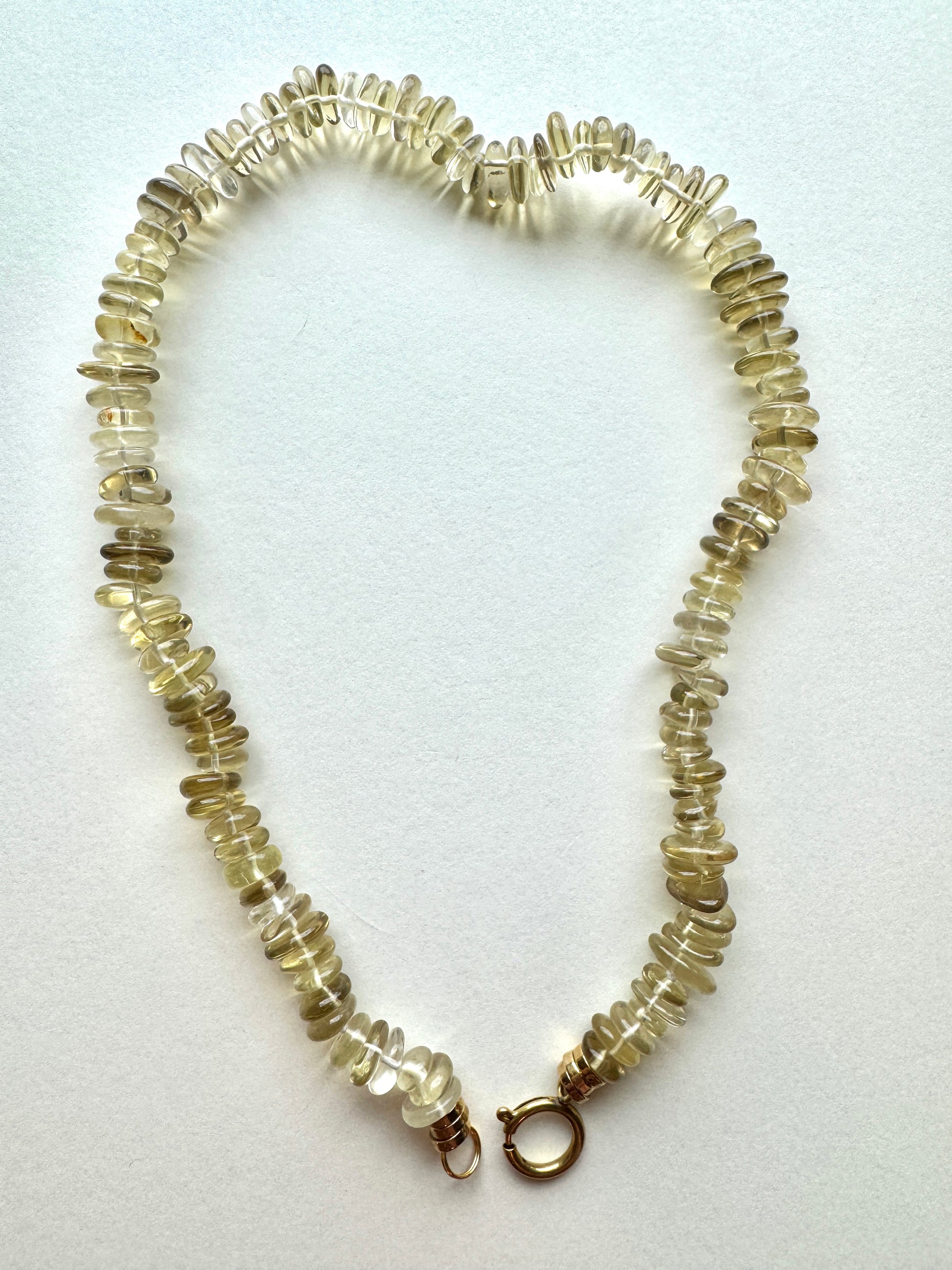 Experience the refined elegance of Limoncello, featuring warm lemon quartz that captivates with its luminous glow. This piece offers a smooth, comfortable weight that enhances its luxurious feel, making it an exquisite addition to any sophisticated collection. 21 inches of solid lemon quartz subtly provides the wearer with clarity, joy, and creativity.