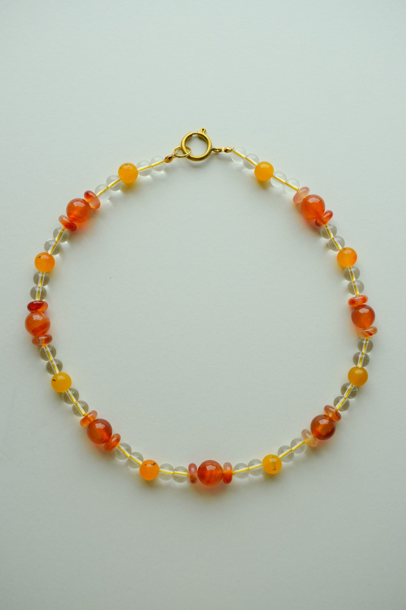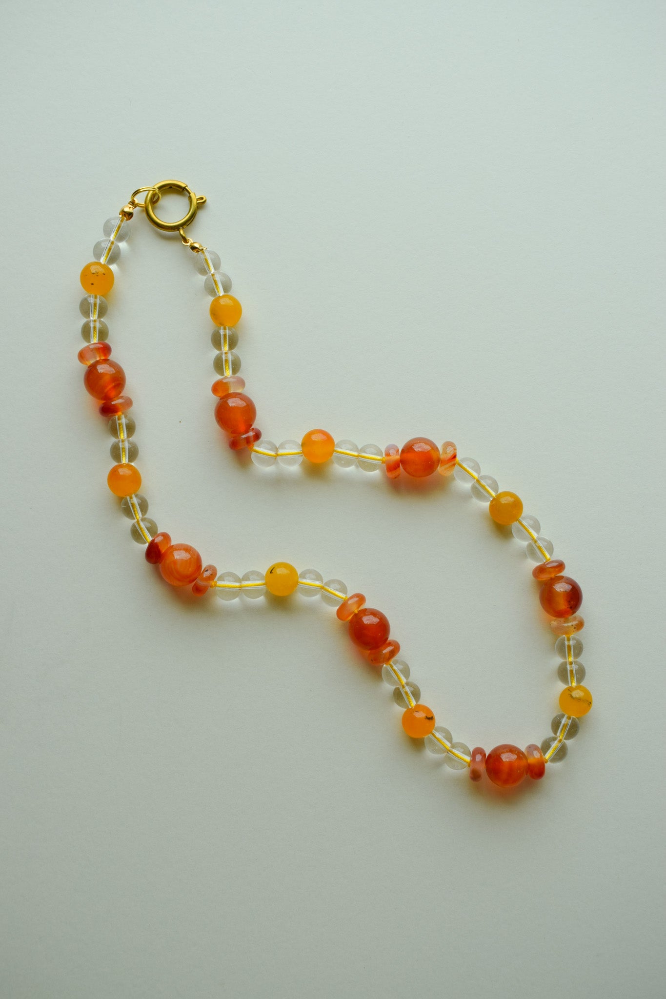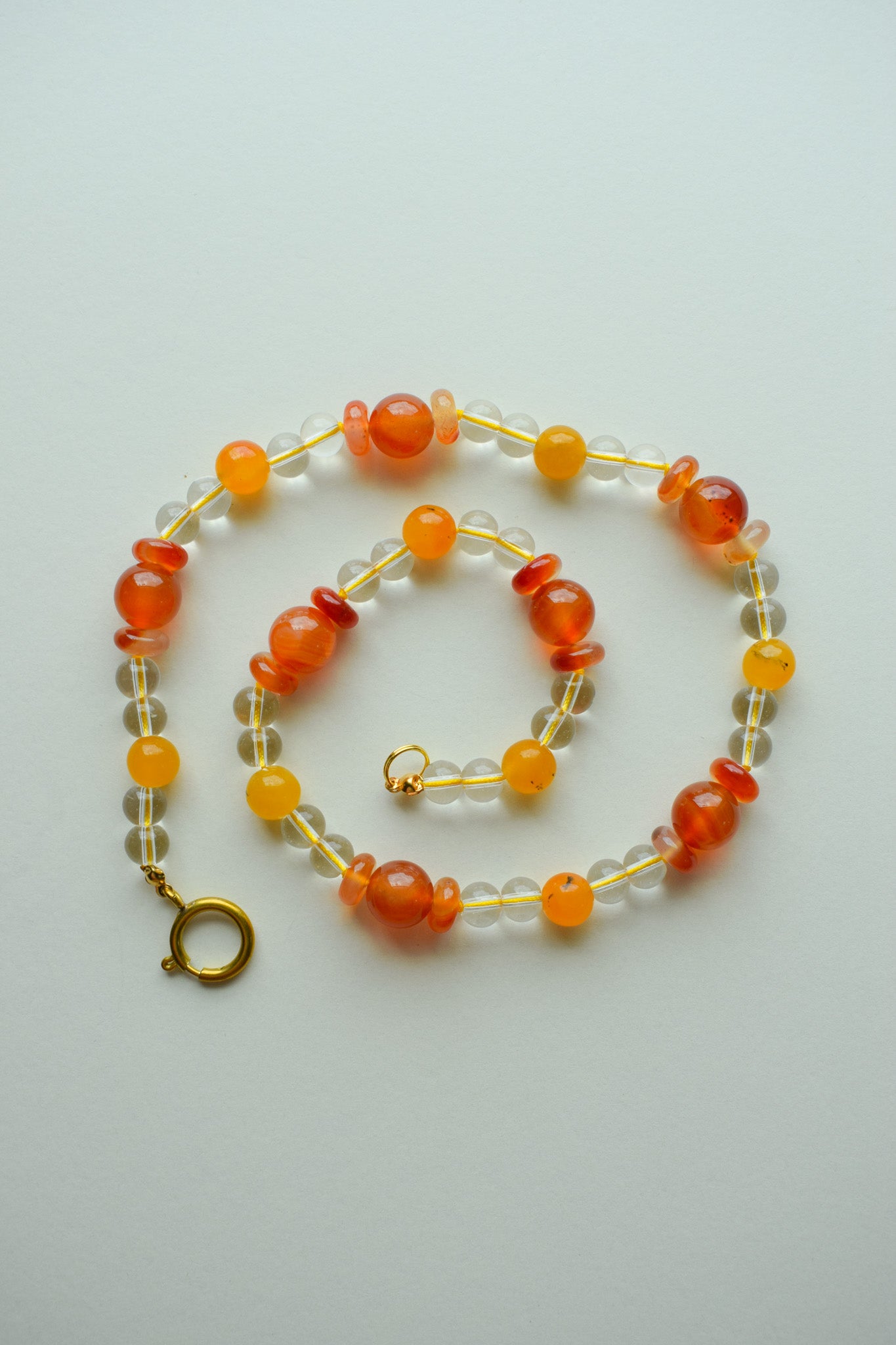 Bring a burst of joy to your day with Liquid Sunshine, a playful blend of quartz, carnelian, and golden quartz. This colorful piece sparkles with energy, adding a fun and vibrant touch to any outfit. Its lively hues brighten your look and mood, making every moment feel sunnier and more spirited.