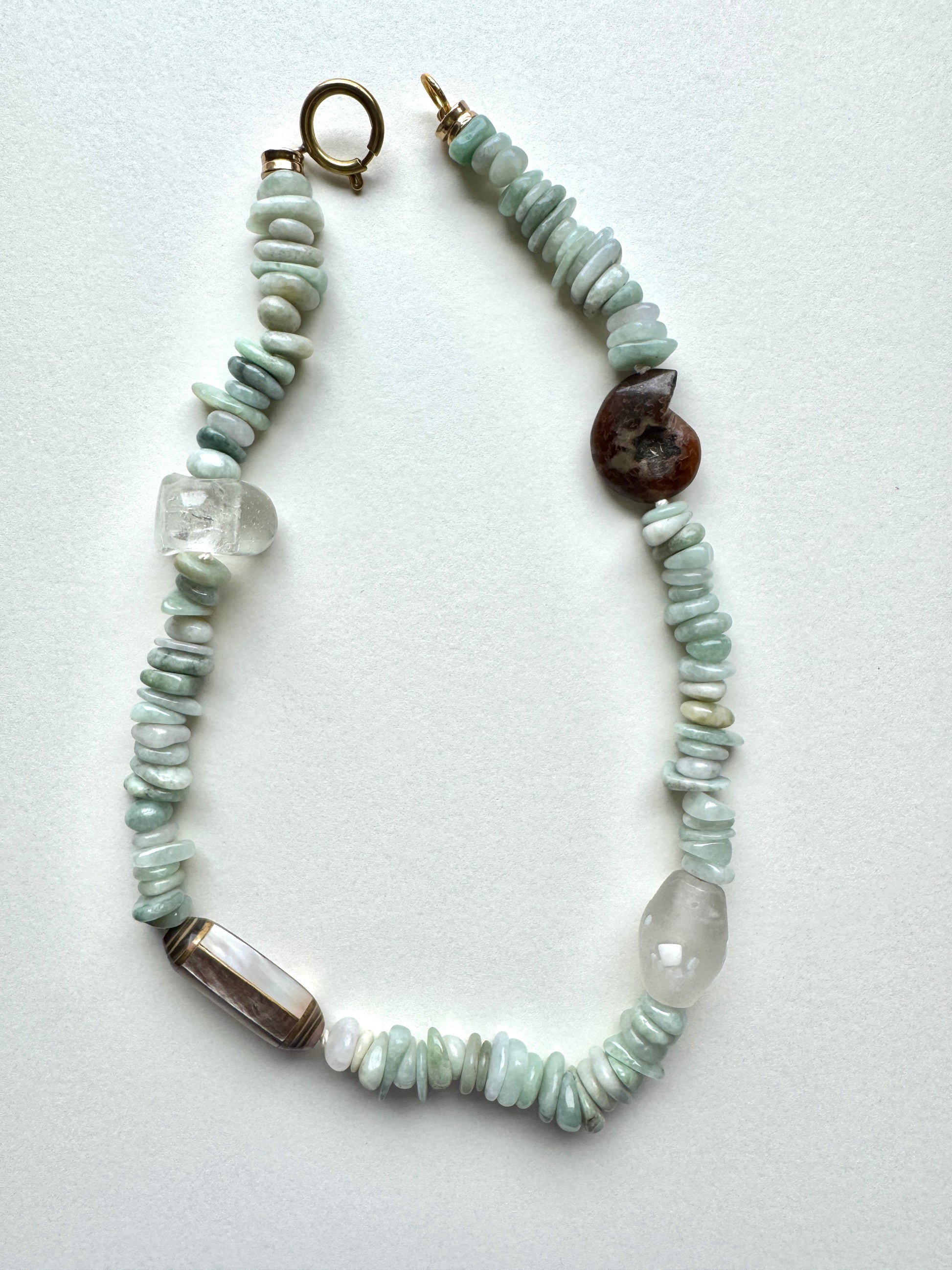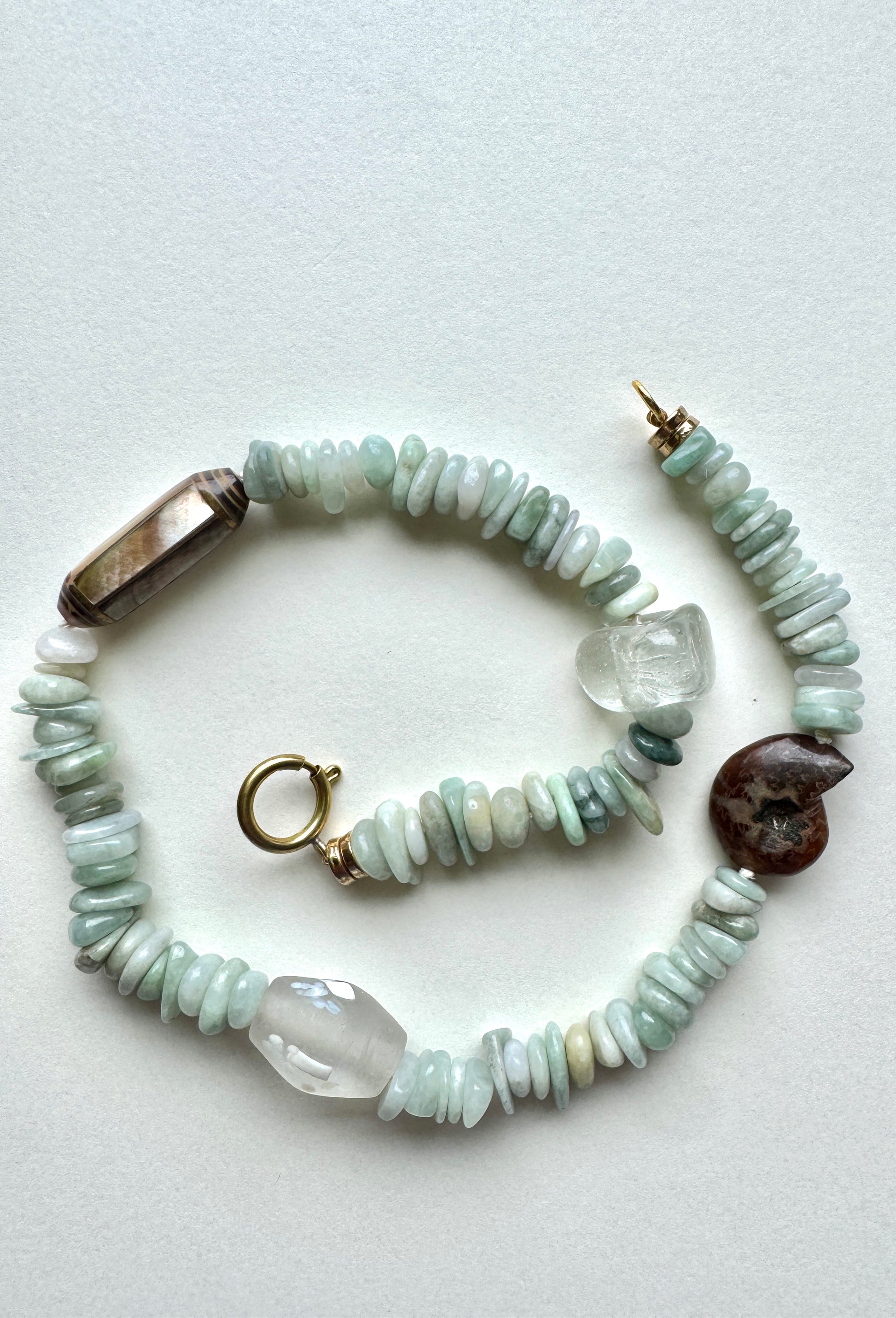 Mermaid Treasures is 18.5 inches of Jade stones hand knotted and interspersed with vintage glass, clear quartz, ammonite, and mother of pearl ending with brass clasp and jump ring. Each bead has a chance to be the star of the show as you can wear it in any direction.