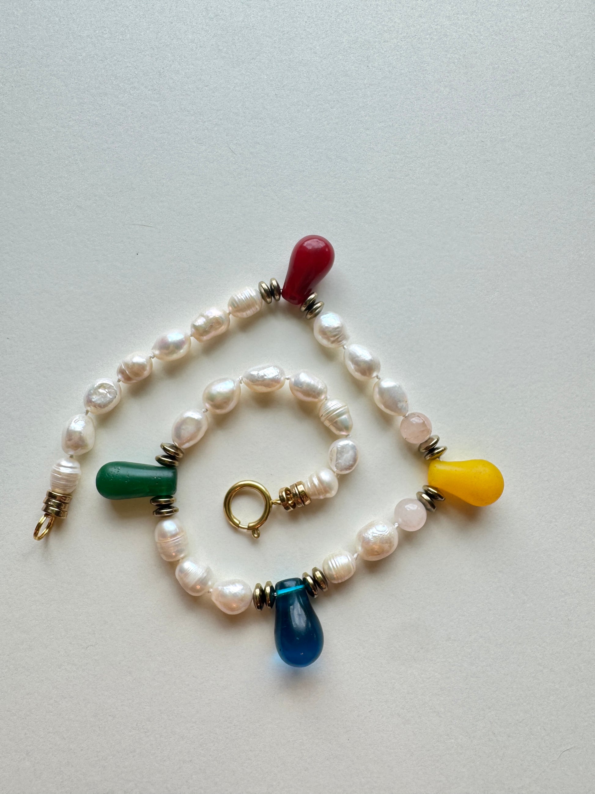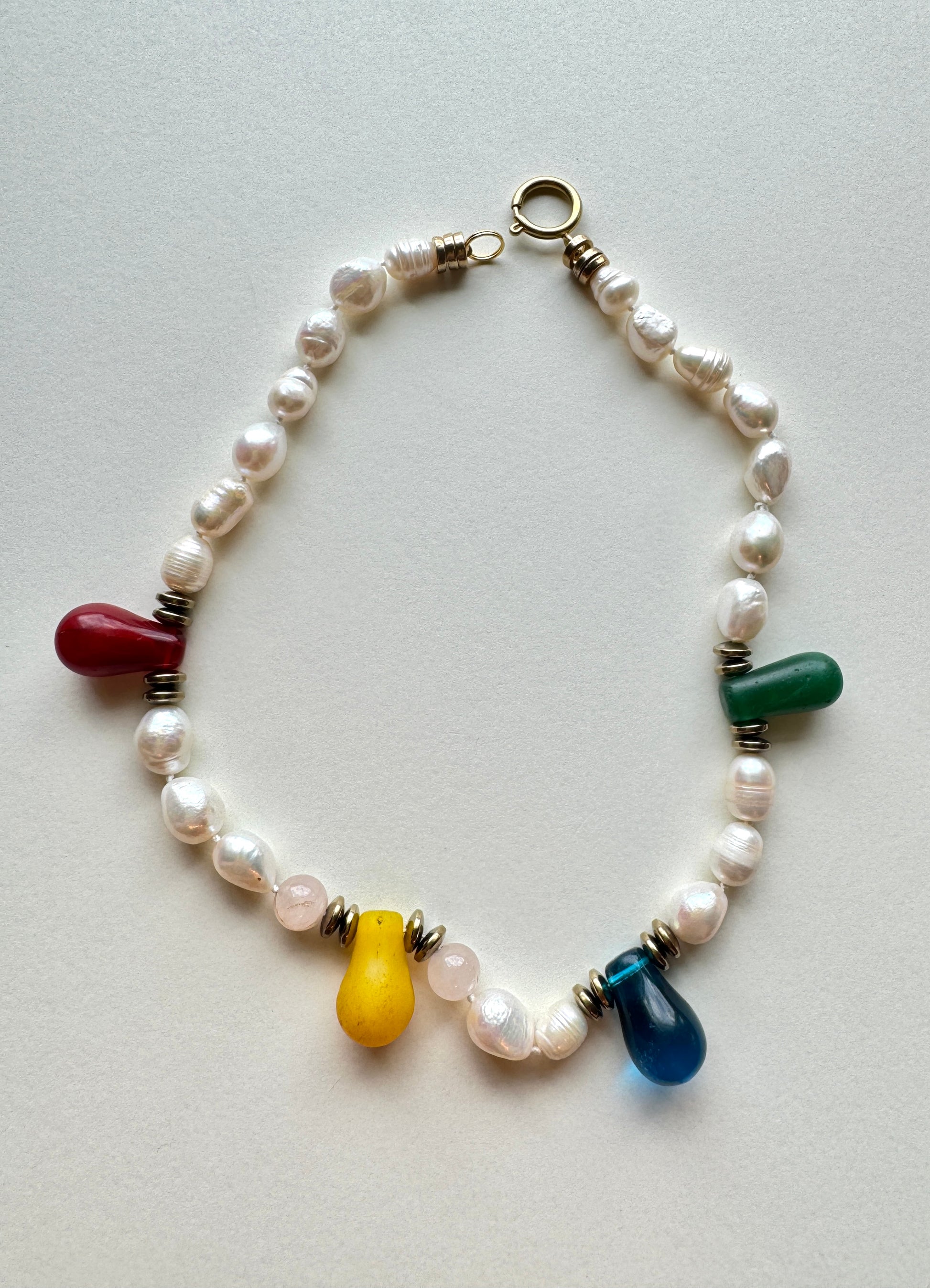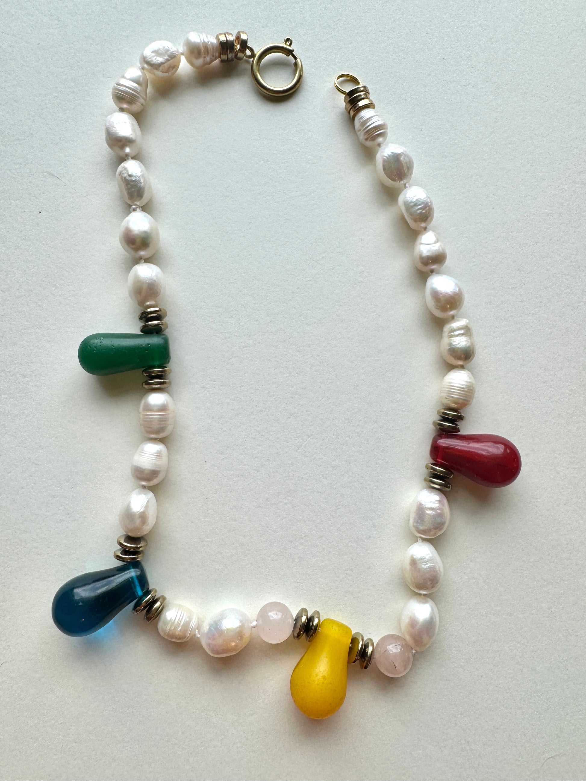 Classic meets bold in our stunning vision of a single strand pearl necklace. Featuring natural baroque pearls, vintage multicolored teardrop glass beads, gold hematite, and rose quartz. The Morgana Pearl is 18 inches of show stopping pearls, the perfect cherry on top of a best outfit sundae. Designed for those who appreciate elegance with confidence, this accessory blends tradition with a modern edge, making it perfect for both everyday wear and special occasions.