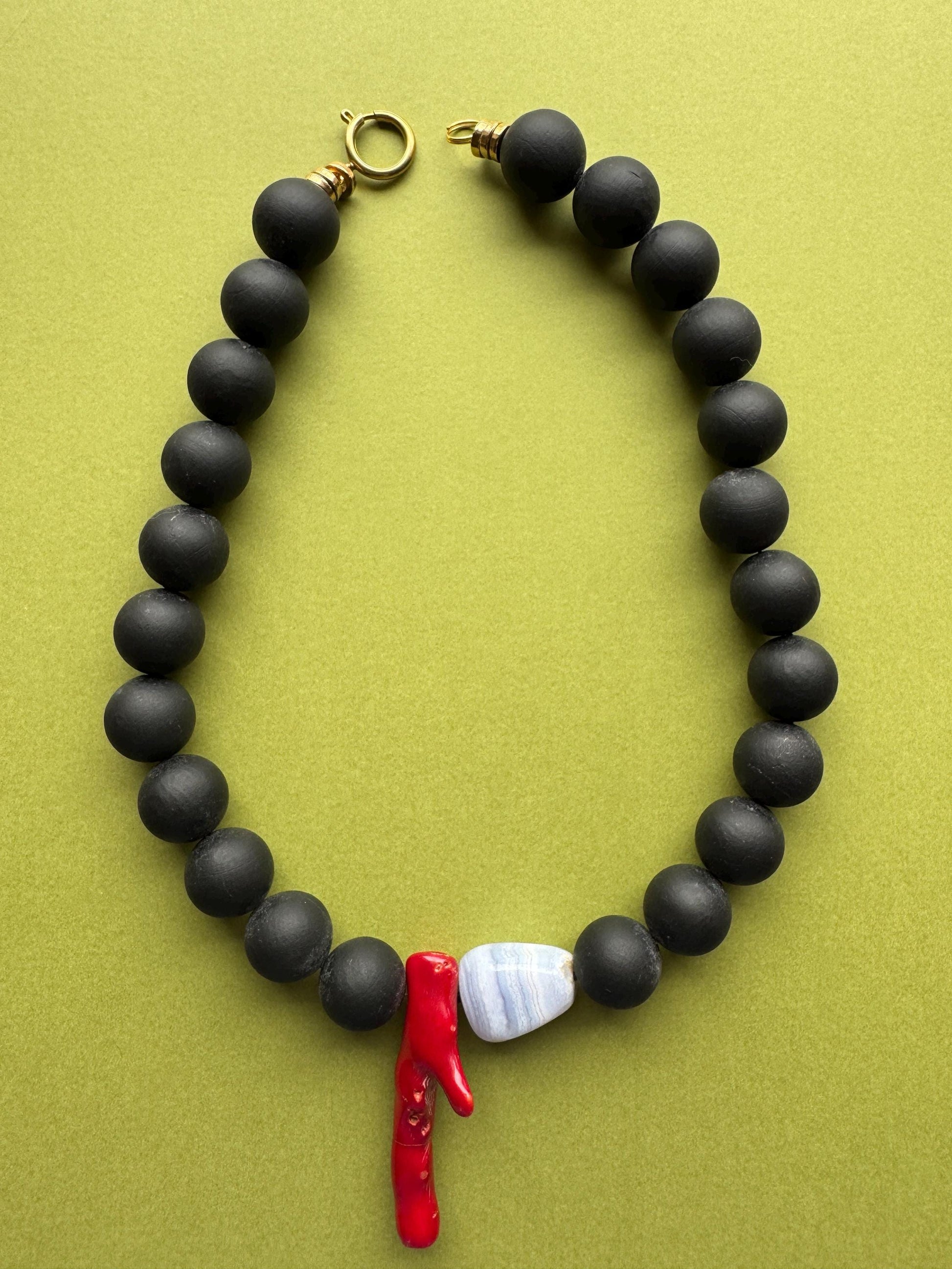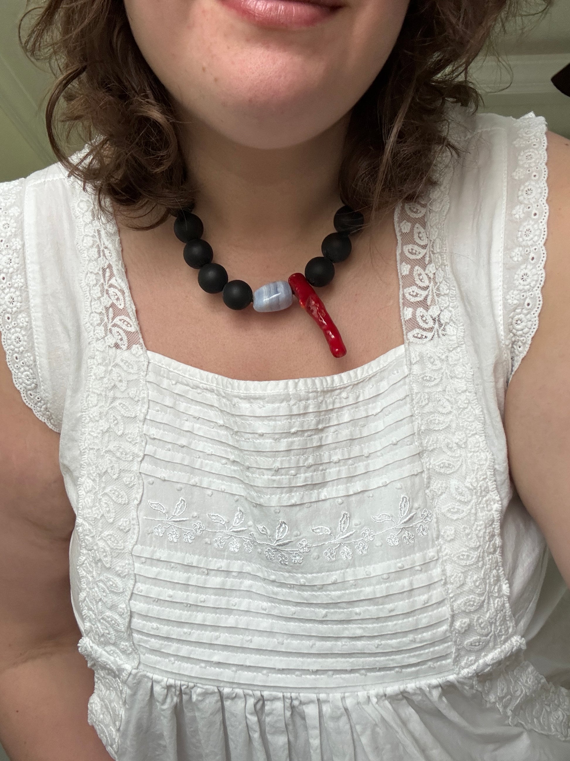 The Ocean Goddess necklace blends bold lava, vibrant coral, and soothing blue lace agate to create a striking statement piece. Its sophisticated design captures the essence of the sea, offering a perfect balance of strength and elegance for those who command attention with subtle confidence. 19.5 inches makes it the perfect length for an unforgettable statement.