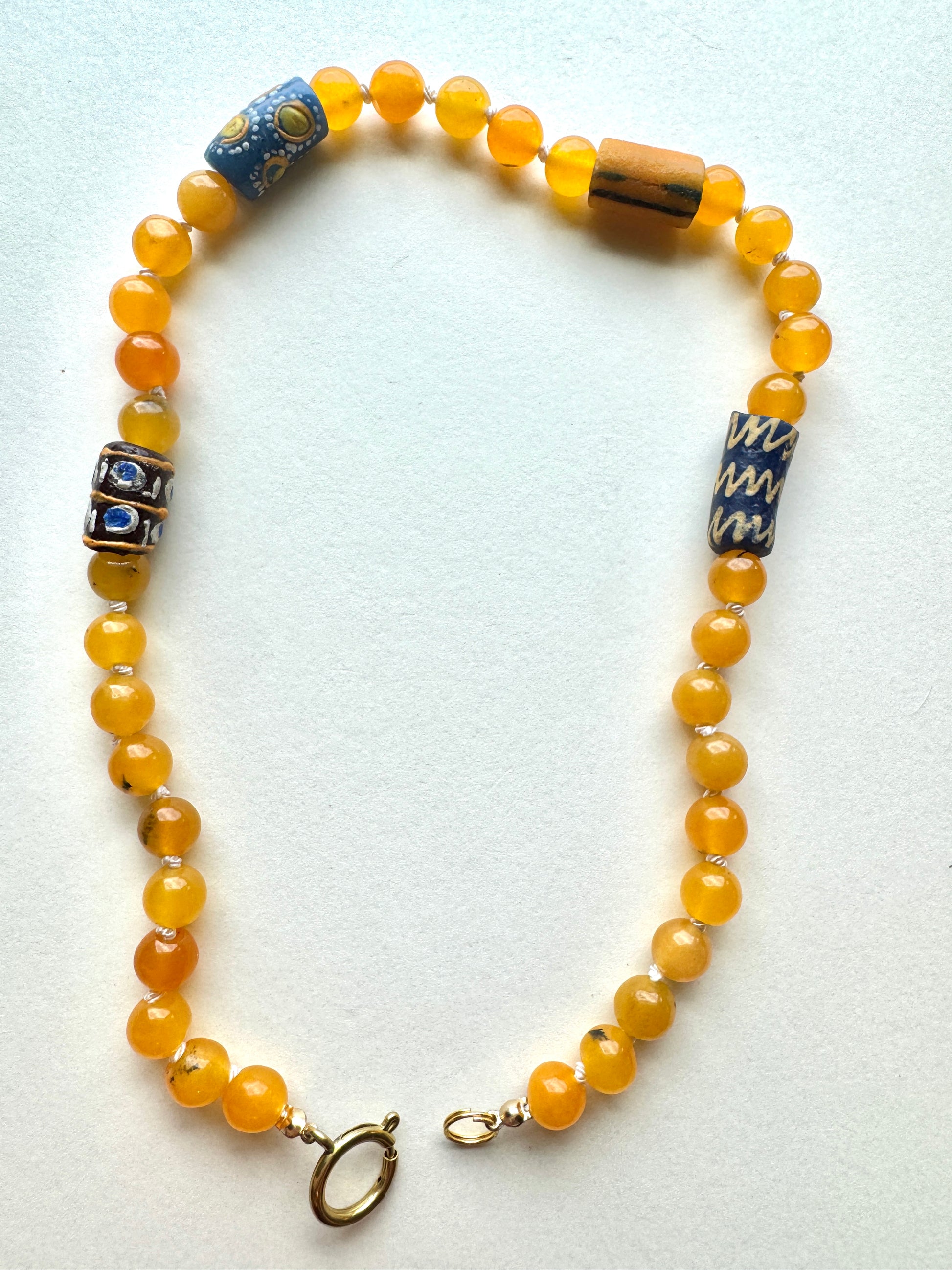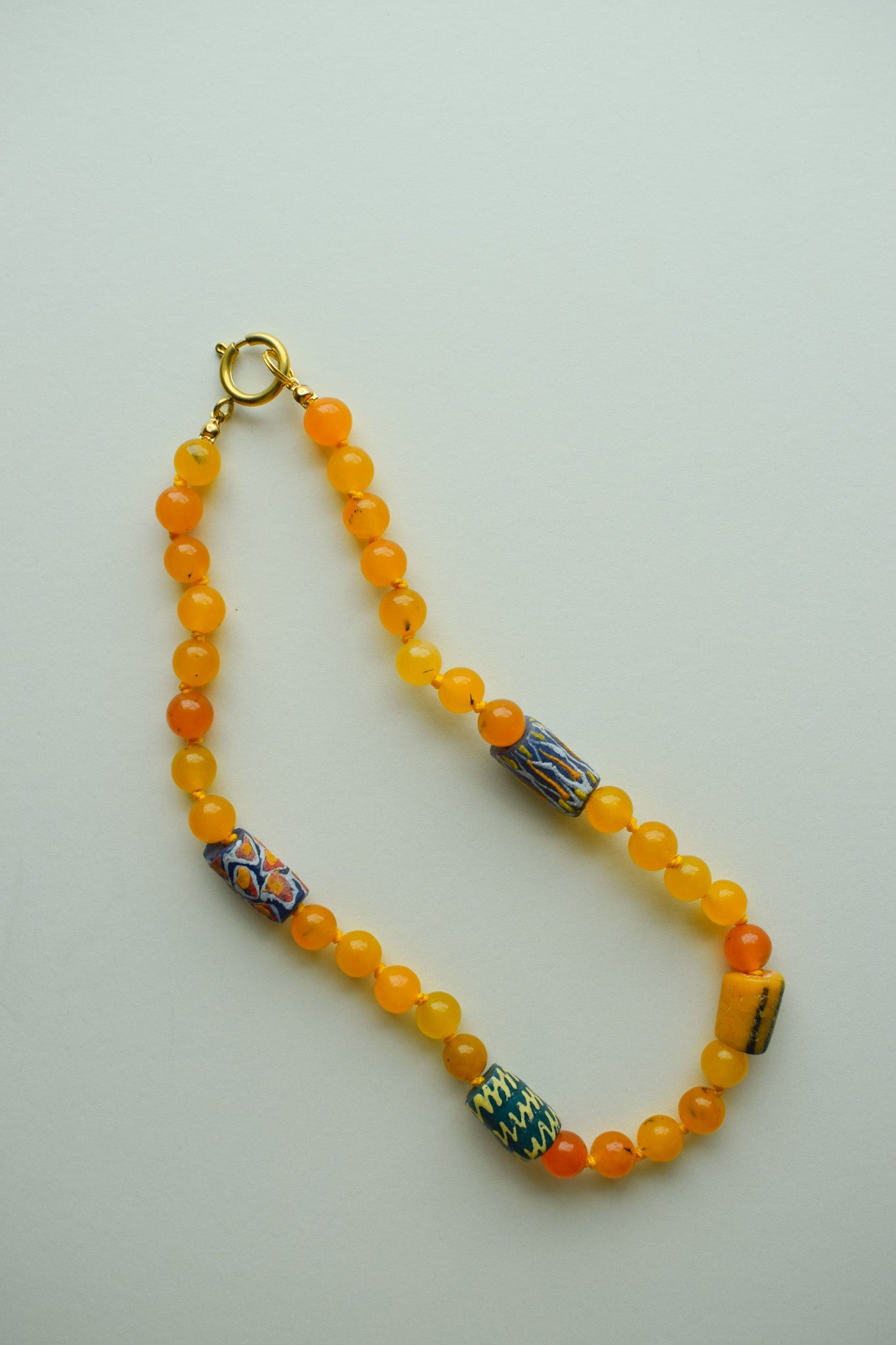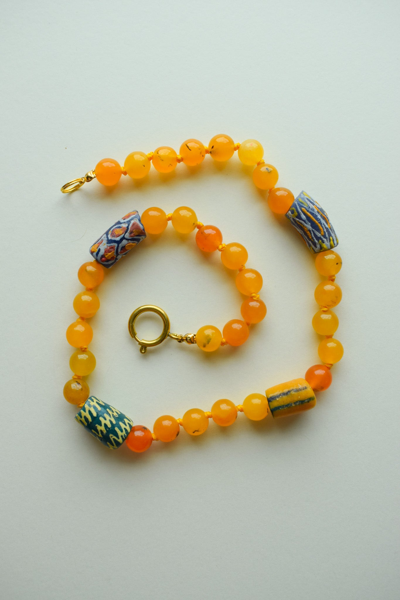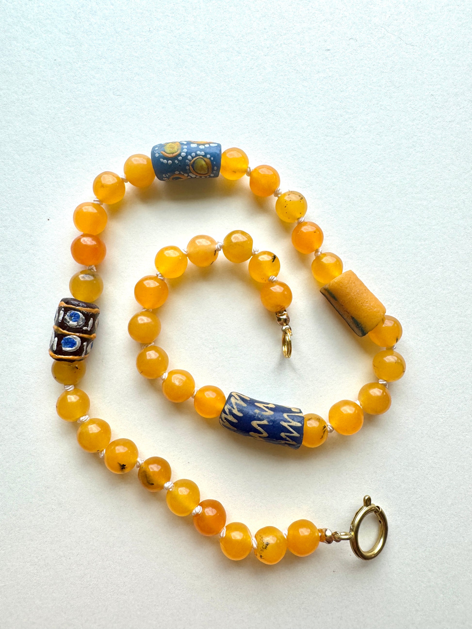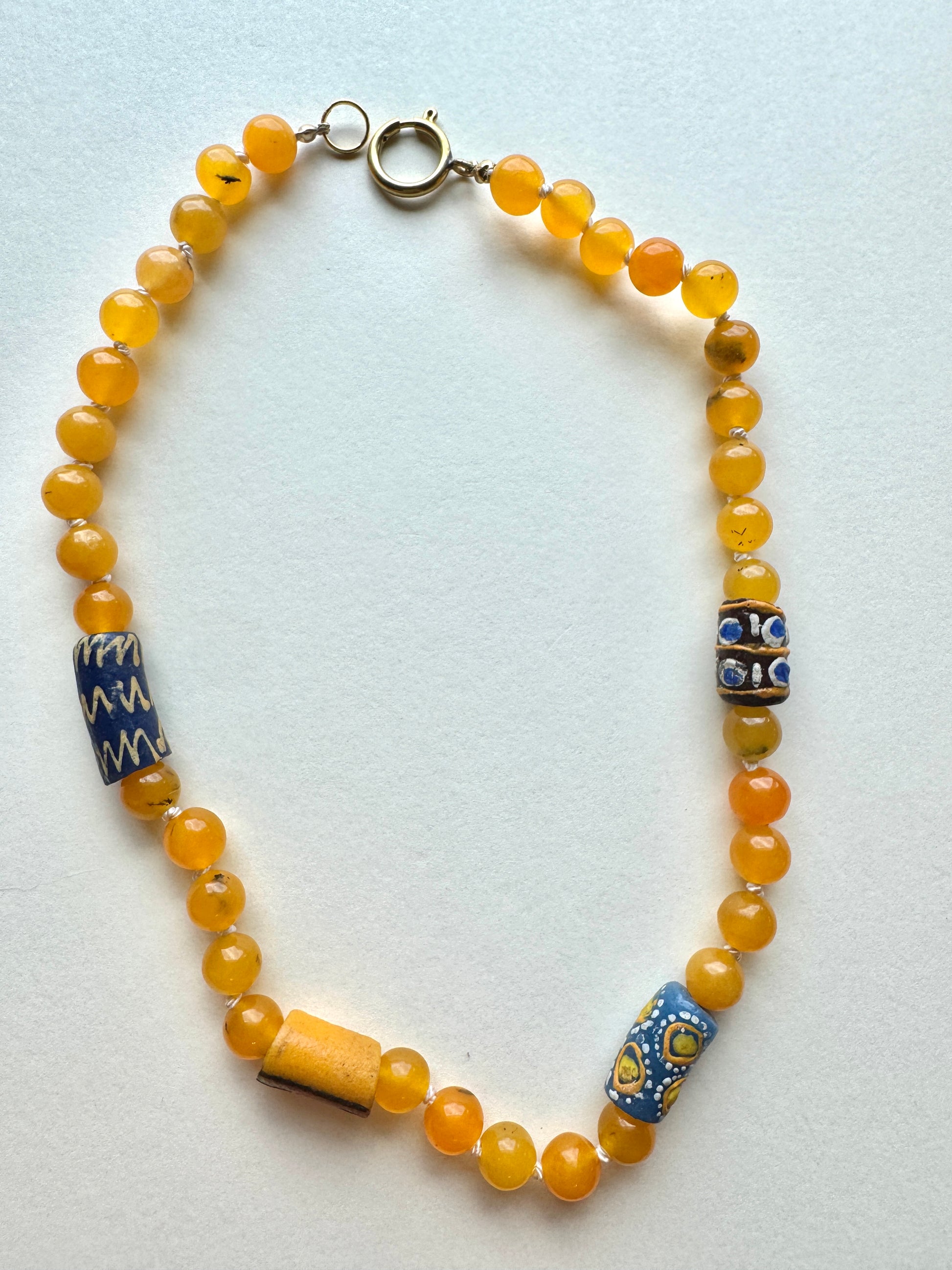 Elevate your look with the Saffron Tradewinds necklace, combining warm golden quartz and vintage African trade beads. This sophisticated statement piece blends boho charm with timeless elegance, perfect for adding a unique, spirited touch to any ensemble. Its vibrant yet refined design captures a sense of adventure and style, making it an unforgettable accessory for those who appreciate handcrafted artistry and cultural heritage.