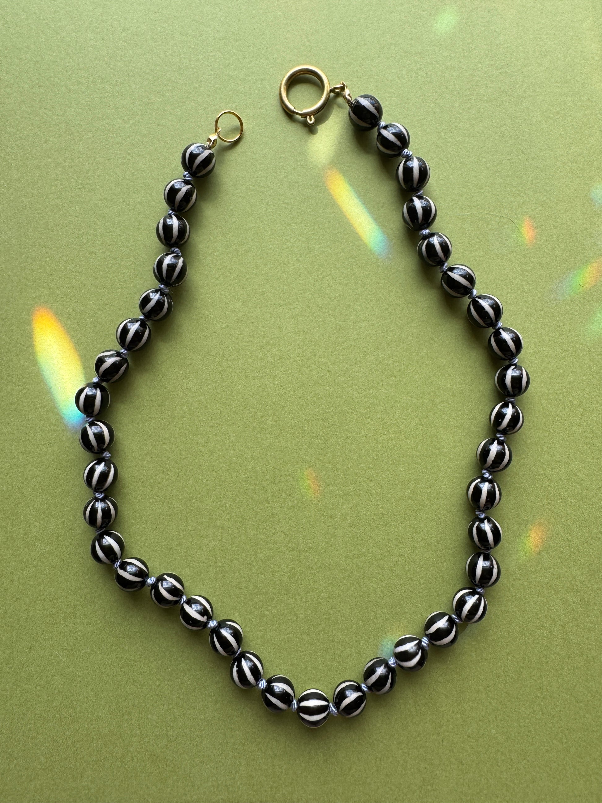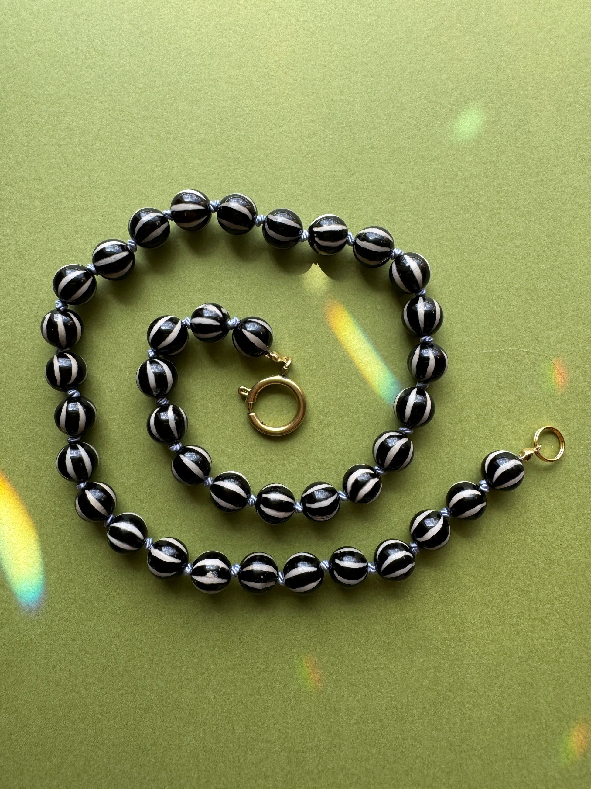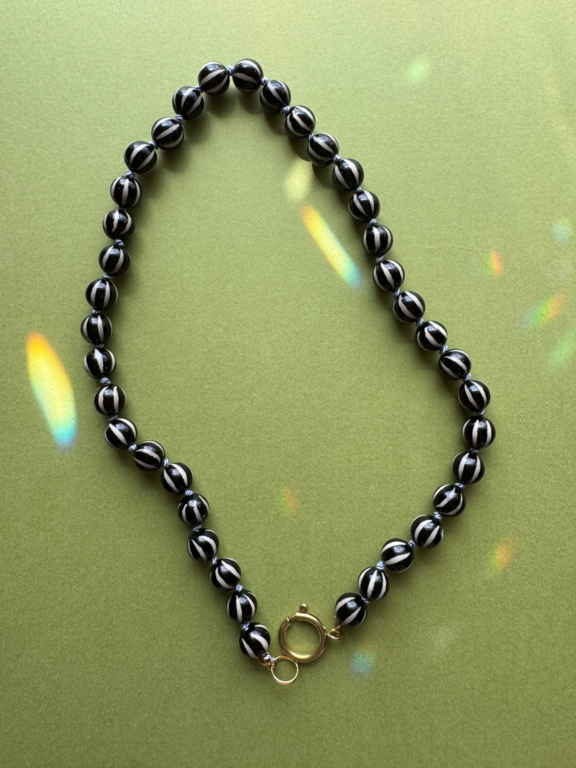 Elevate your look with Stripes off to the Races, featuring exquisite Tibetan striped agate beads expertly hand-knotted on delicate lilac silk. This sophisticated piece balances natural earth tones with a subtle pop of soft color, perfect for adding refined charm to any outfit. The artisanal craftsmanship ensures durability and a unique texture, inviting you to wear a story of elegance and playful spirit.